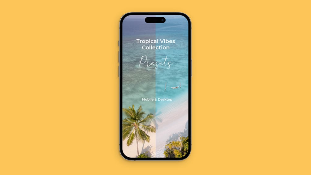 Tropical Vibes Presets: Beach, Cocktail, Coconut, Dragon Fruit, Jungle Vibes, Ocean Lover, Palm Tree, Paradise, Salty Hair, Sandy Body, Sunset Glow, Sunset, Tropical Film, Waterfall.